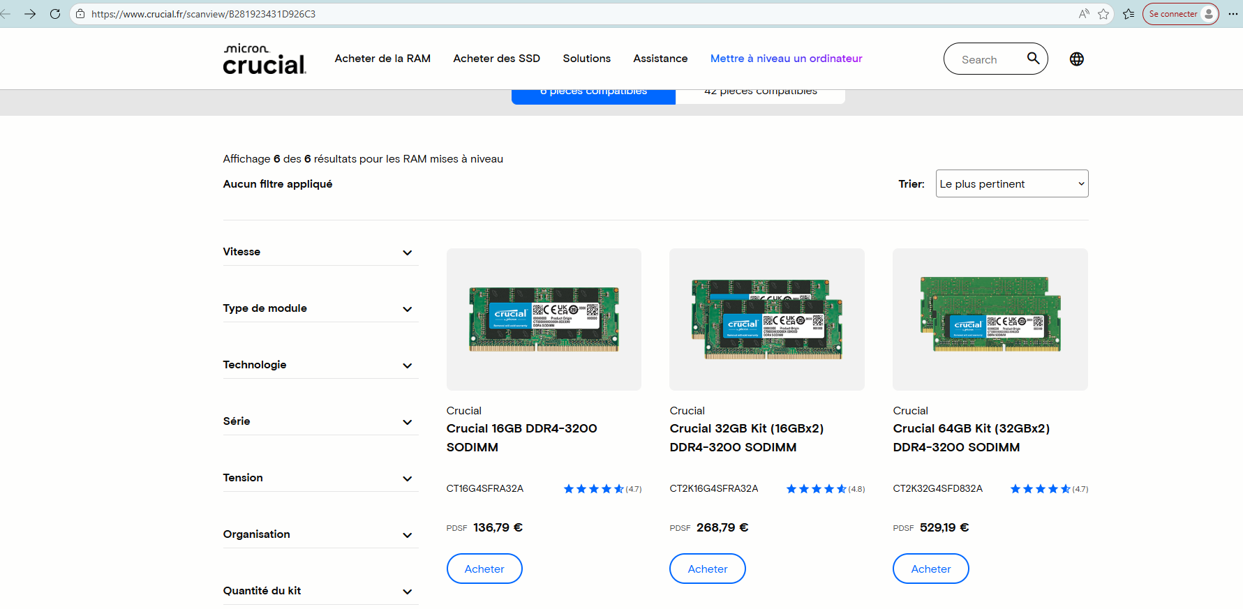 Mais disons que si, en utilisant d'autres moyens ou si tu es arrivé à déduire que telle ou telle barrette de RAM conviendrait à ton PC, et que le scanner Crucial parvient à un résultat identique ou similaire, ben c'est une information supplémentaire qui te confortera dans ton choix...