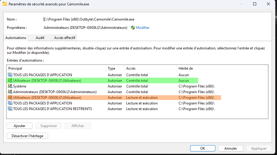 J'ai tenté de modifier les autorisations mais je n'y arrive pas. J'ai modifié ici et je pensais naïvement que c'était bon :