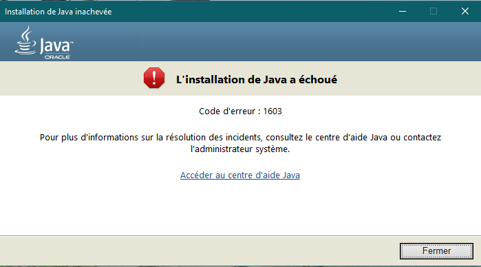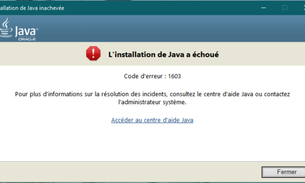 Bonjour à tous, je ne sais pas si je suis dans la bonne rubrique, bref, j'ai voulu faire une mise à jour de Java et ça a échoué, avec l'erreur 1603, je l'ai cherché dans le panneau de configuration et il a disparu alors que je l'avais déjà téléchargé, je suis allé sur le site pour le télécharger de nouveau et il ne s'installe plus, j'ai ce code d'erreur, voilà, alors déjà est-ce que l'on est obligé de l'installer, sinon comment faire ? Merci pour votre retour. Cordialement Jean-Louis