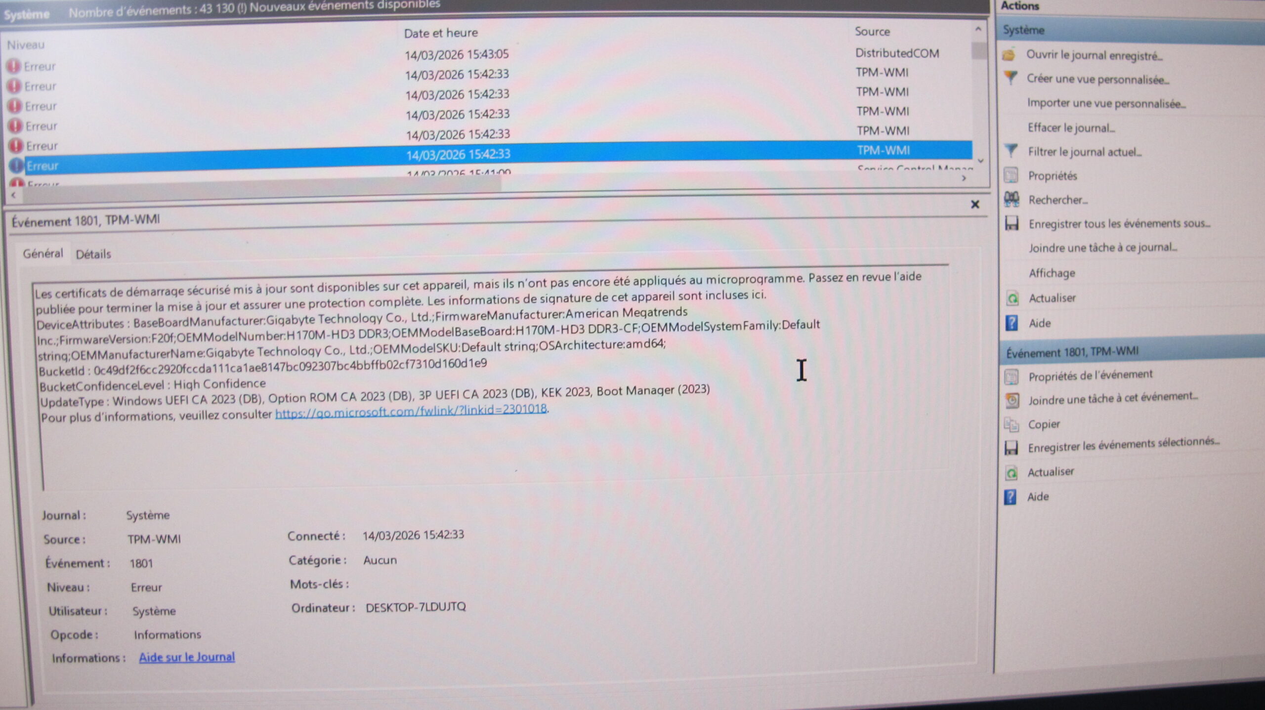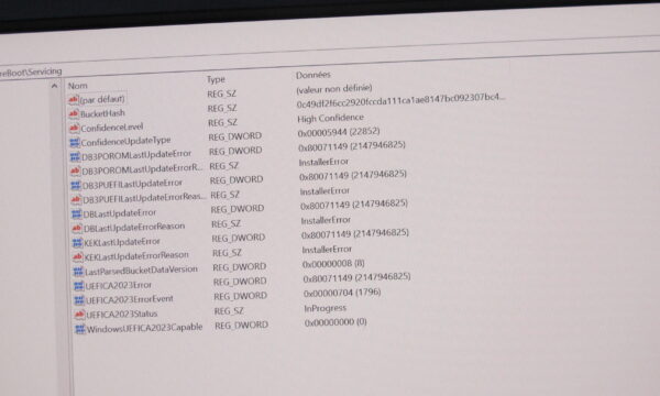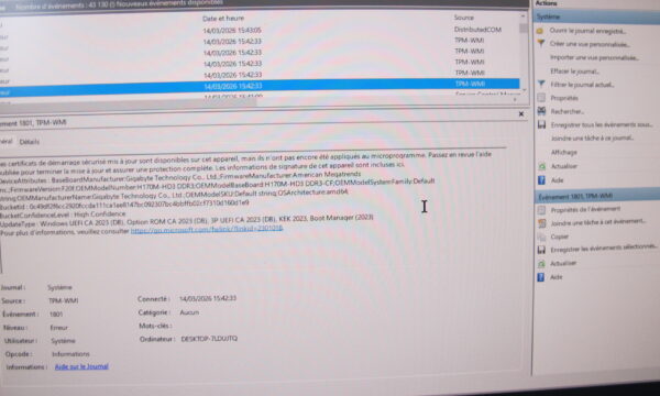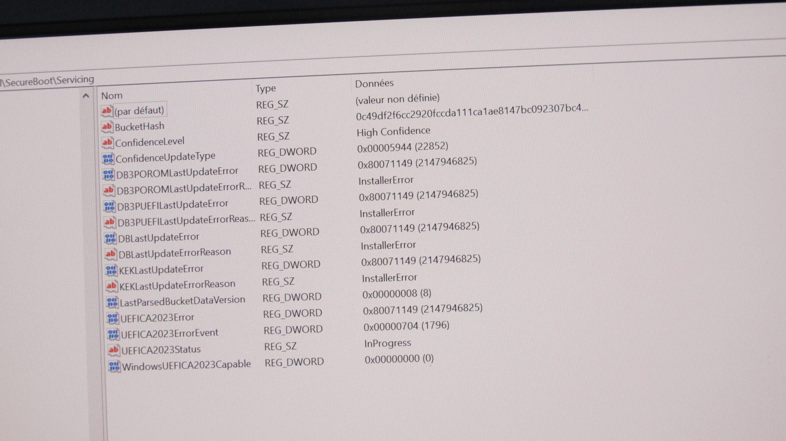 Bonjour tout le monde, problème que je n'arrive pas à résoudre !! impossibilité d'installer CA 2023. Depuis le début j'ai essayé toutes les solutions proposées dans les mails, sauf Rufus. L'observateur d'événement m'indique : TPM-WMI évent ID 1801 : les certificats de démarrage sécurisés mis à jour sont disponibles sur cet appareil, mais n'ont pas été appliqués au micro programme, et sur l’éditeur de registre : error 0x8071149 : le démarrage sécurisé n'est pas activé! et si j'active, Windows ne démarre pas. Dans mises à jour Windows update, je n’ai pas la KB 5075912, je passe de KB 5077863 à KB 5081277 et KB 5078885 la dernière.