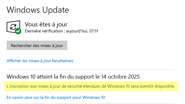 Le compte Microsoft utilisé pour se connecter à l’outil d’inscription à l’ESU activera la prolongation des mises à jour de sécurité sur le périphérique jusqu’au 13 octobre 2026, à condition que vous continuiez à vous connecter à Windows avec votre compte Microsoft utilisé pour l’inscription.
